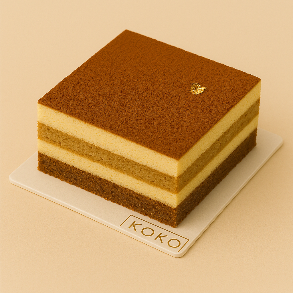 Our signature tiramisu — layered with coffee-soaked coconut biscuits, luscious cream cheese, and a touch of cocoa magic.